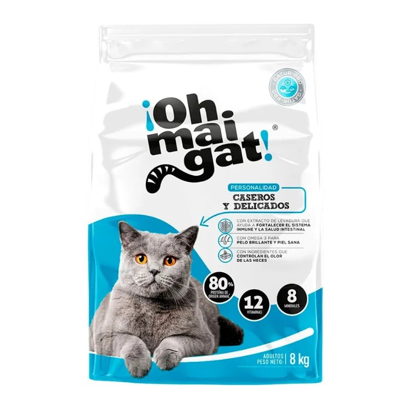 ¡Oh Mai Gat! Caseros y Delicados es un alimento completo seco para gatos adultos de todas las razas, basado en la personalidad y rasgos particulares de los gatos. Además de deleitar su paladar con su exquisita combinación de ingredientes, le aporta el balance de nutrientes ideal para su personalidad que lo mantendrá saludable. Si tu gato necesita mejorar sus defensas y la mayor parte del tiempo está en un mismo sitio, ¡Oh Mai Gat! Caseros y Delicados es el alimento ideal.