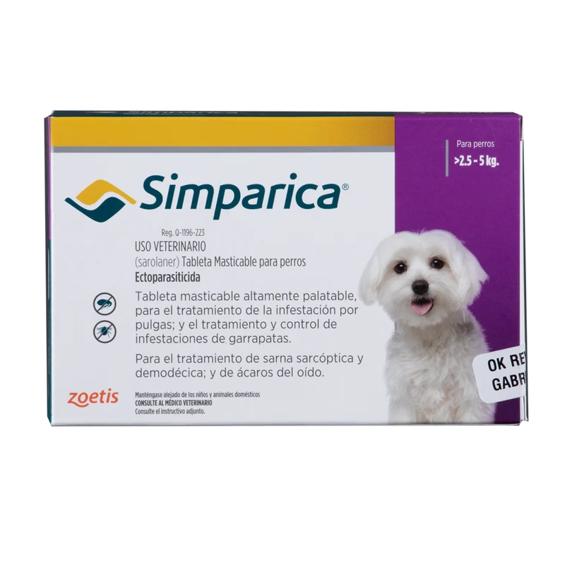 Simparica es un desparasitante externo de acción rápida y prolongada que protege a tu perro contra pulgas, garrapatas y ácaros durante 35 días continuos. Su fórmula a base de Sarolaner actúa eficazmente desde la primera hora eliminando parásitos antes de que puedan transmitir enfermedades. Es ideal para perros de todos los tamaños y razas, y su presentación masticable con sabor agradable facilita su administración mensual. Una solución confiable para mantener a tu mascota libre de parásitos y con una piel saludable.